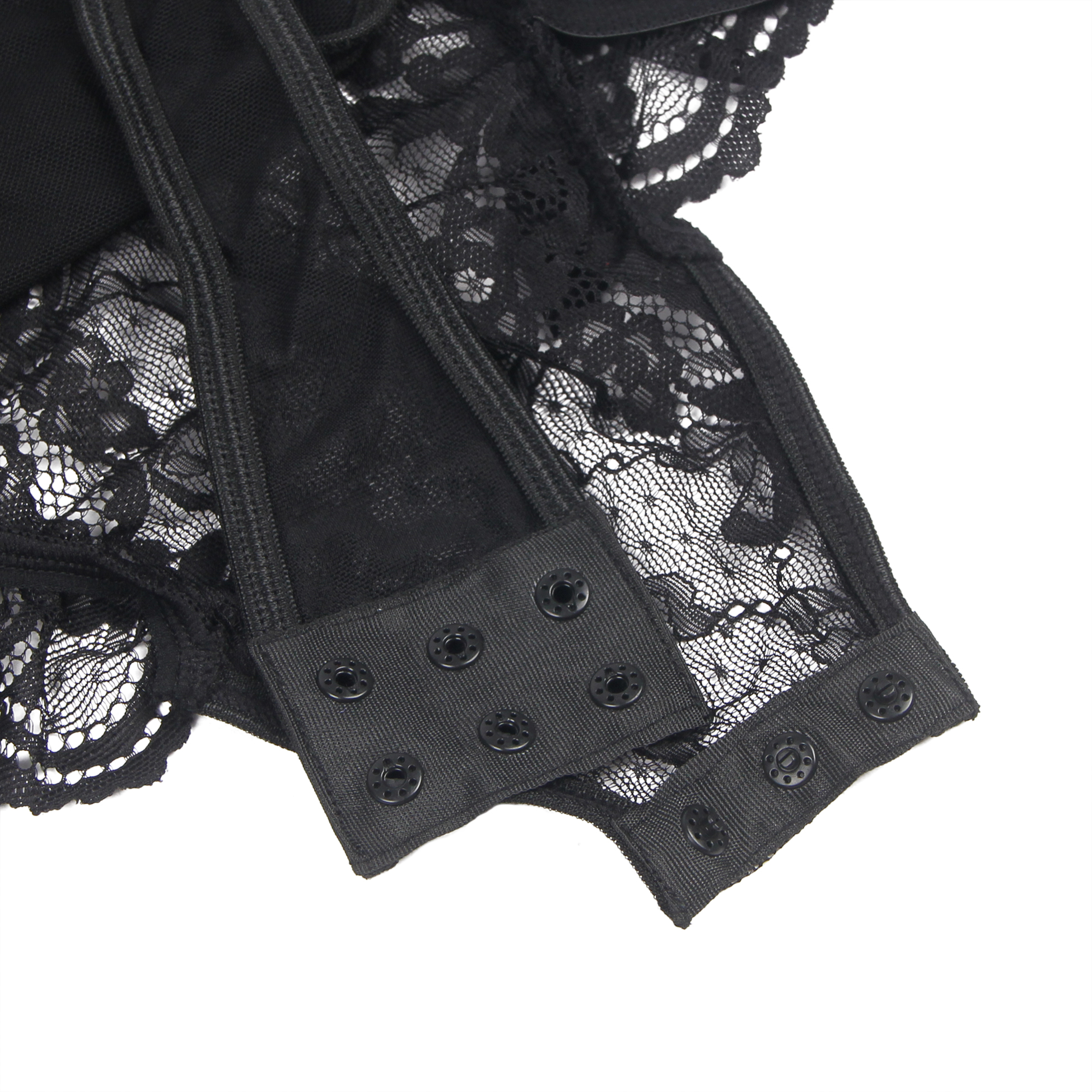 Le harnais porte-jarretelles est conçu dans le même esprit avec la dentelle florale. Bordées de sangles en dentelle en guise de jarretelles réglables, vos cuisses sont entourées de fines jarretières au bout des quatre jarretelles pour un style original et provocant.