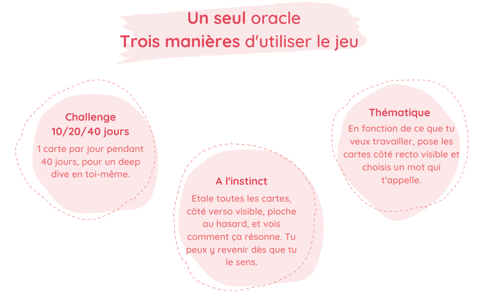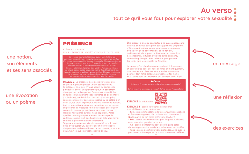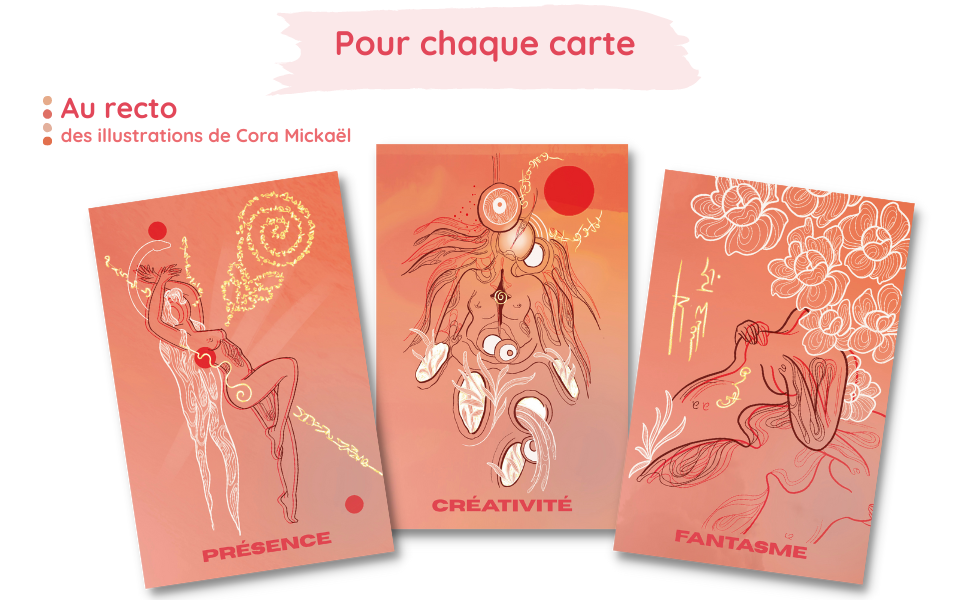 Notre mission à travers cet oracle : rendre plus accessible ta relation à ta sexualité, à l’exaltation de tes sens et à l’expression de ta sensualité. Nous sommes convaincues qu'il s'agit d'une porte d'entrée vers une vie aussi orgasmique qu'authentique. Inspirées de nos propres cheminements, chaque carte propose un travail sur soi ludique, interactif et riche de sens.