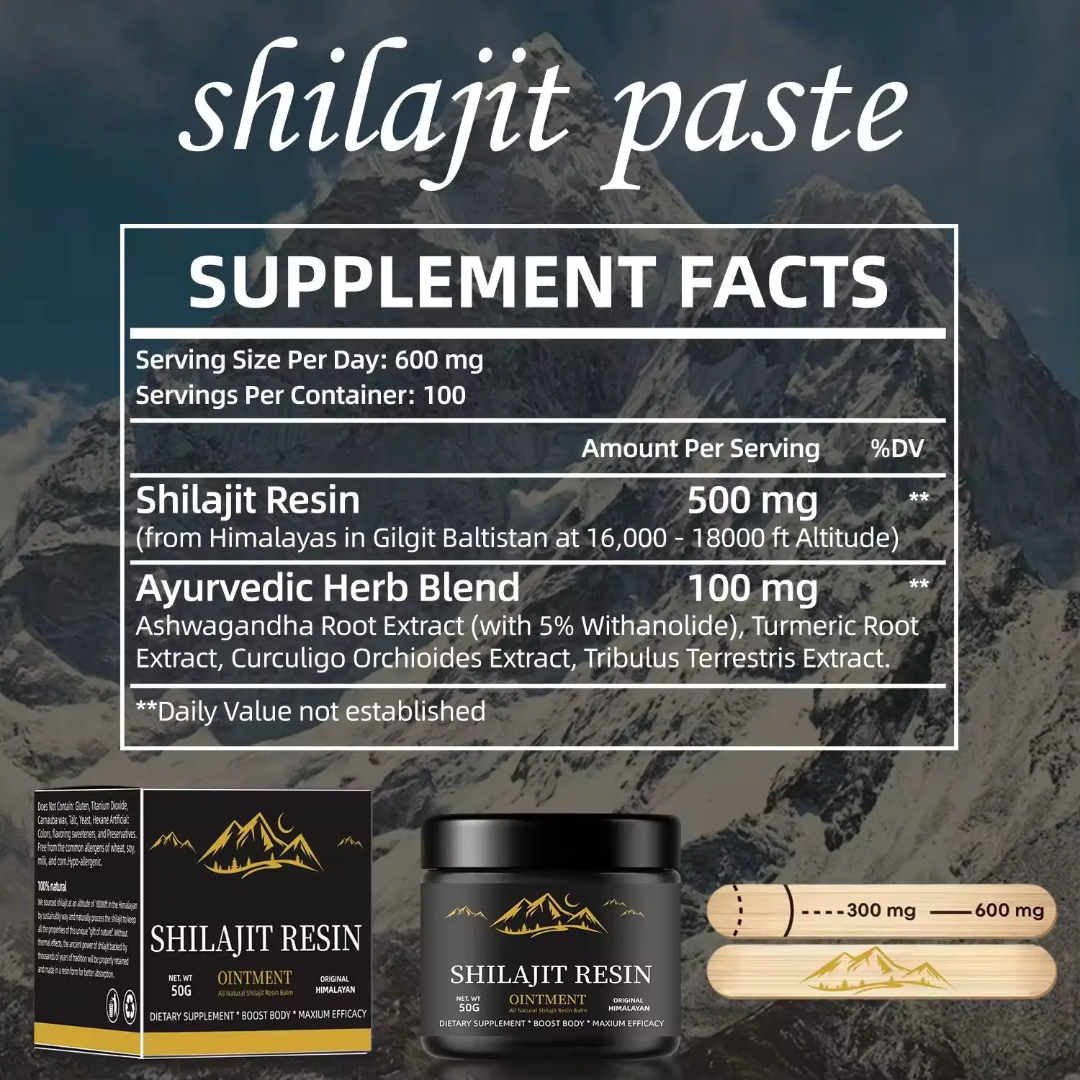 Ingrédients : 100% Résine de Shilajit Purifiée, récoltée à haute altitude, purifiée à l'eau de source et sans aucun additif ni conservateur.