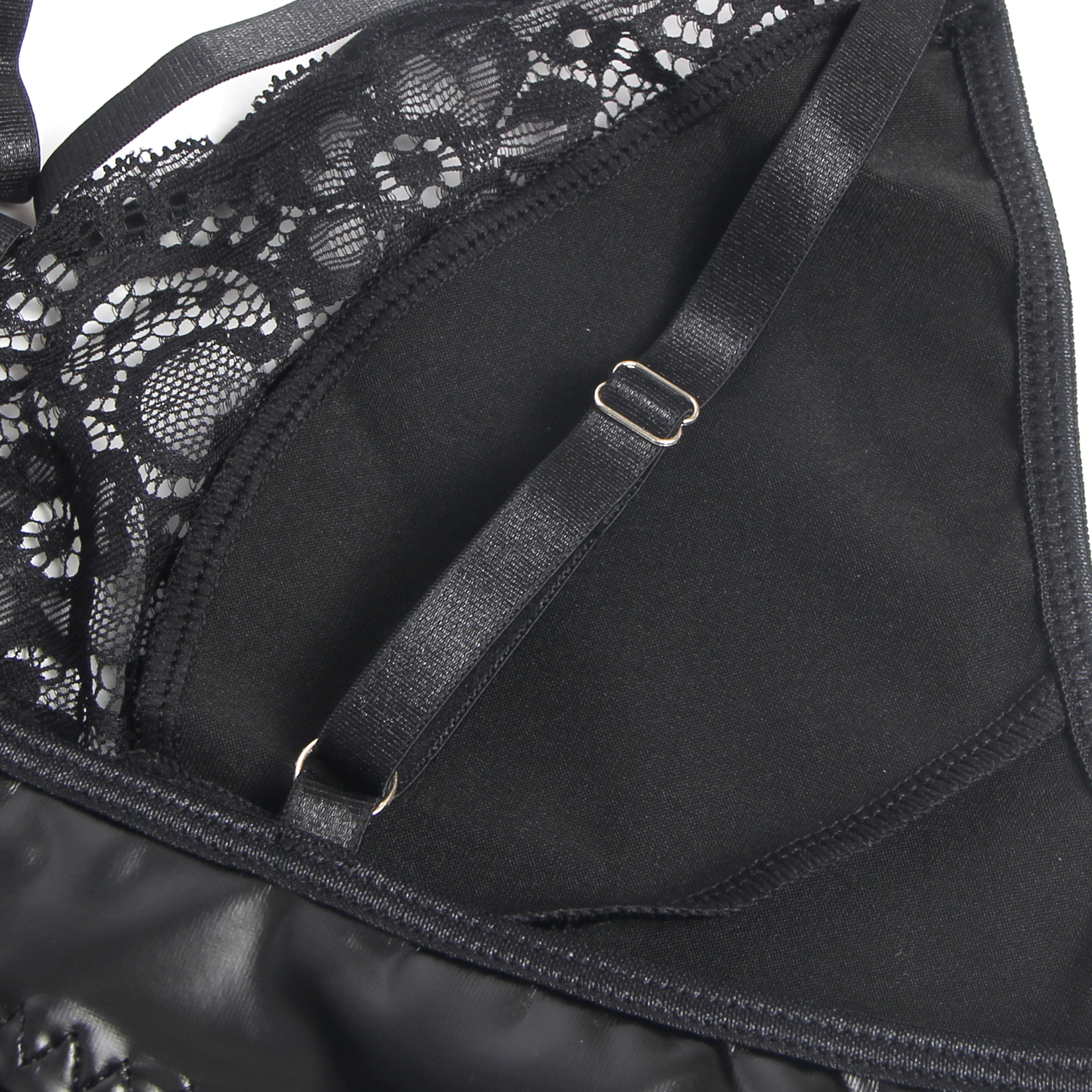 Cette robe nuisette est confectionnée en simili-cuir et agrémentée de dentelle sophistiquée. Le simili-cuir offre un aspect élégant, similaire au cuir véritable, tout en étant plus léger et flexible. La dentelle ajoute une touche de féminité et de glamour, parfaite pour un look séduisant.